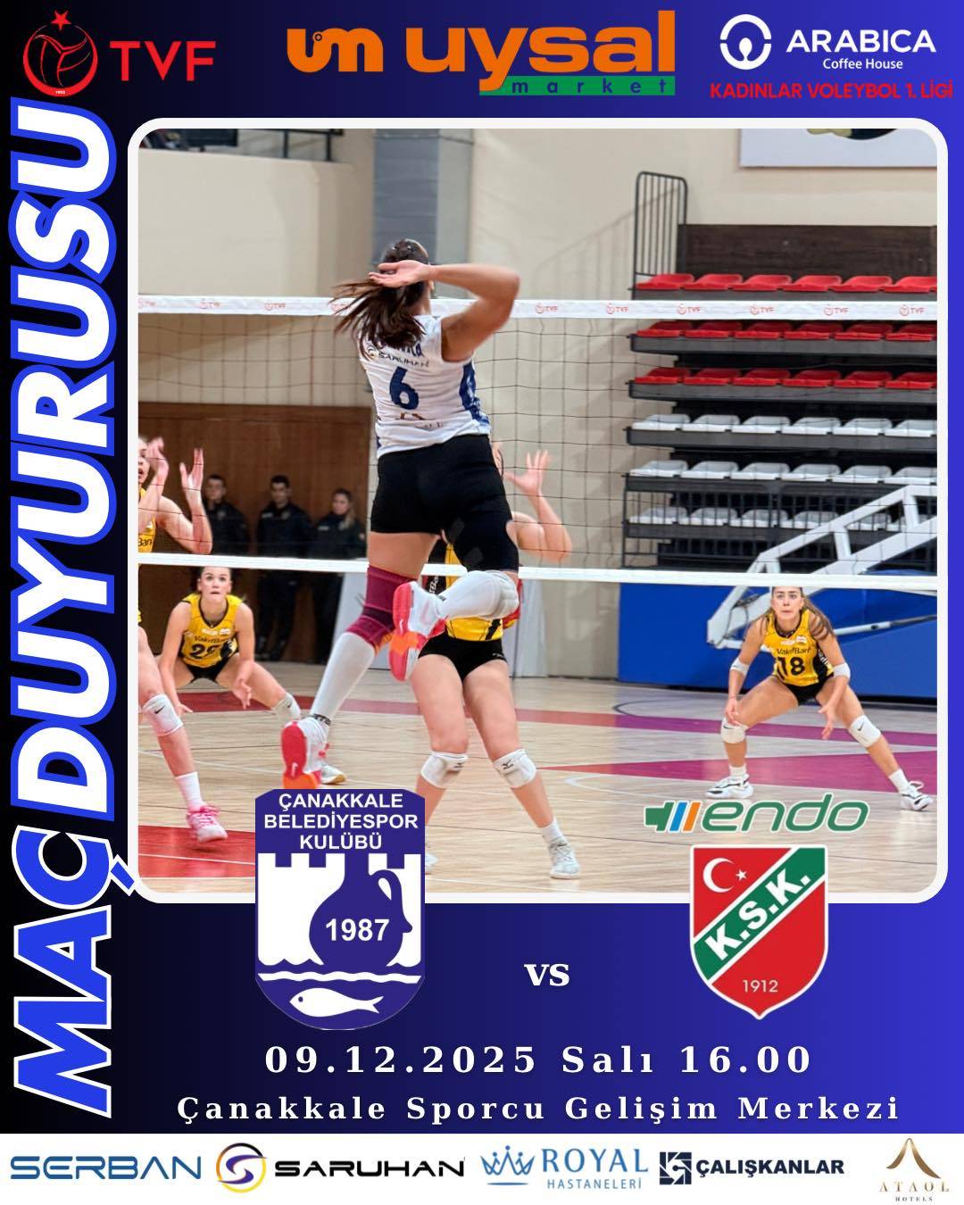 Türkiye Voleybol Federasyonu tarafından düzenlenen Arabica Coffee House Kadınlar 1. Ligi’nde 7. haftanın ertelenen karşılaşması, 9 Aralık 2025 Salı günü oynanacak. Çanakkale temsilcisi Çanakkale Belediyespor, İzmir ekibi ENDO Karşıyaka’yı sahasında konuk edecek.